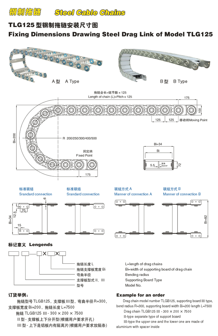 TLG125II型打孔式鋼制拖鏈:簡(jiǎn)介:節(jié)距125mm,彎曲半徑有200,250,300,350,470,500,575,.鏈板高度100mm,拖鏈最大打孔75mm。