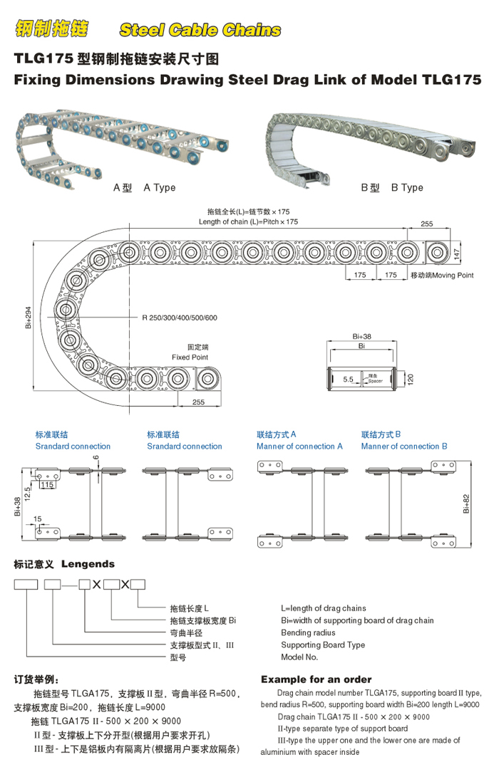 產(chǎn)品TLG175F型全封閉鋼制拖鏈:簡介:節(jié)距175mm,彎曲半徑有250,300,350,470,500,600,.鏈板高度150mm,拖鏈內(nèi)高120mm。