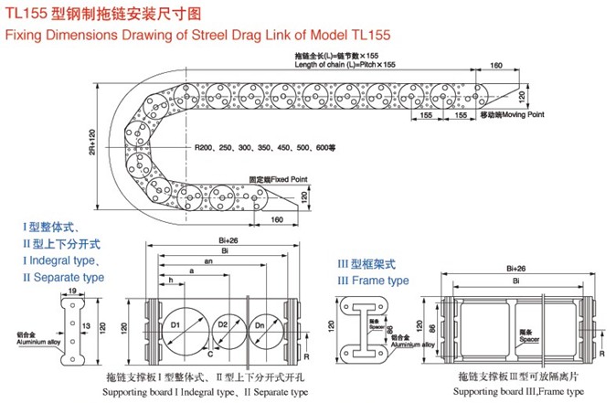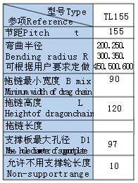 TL155III型鋼制拖鏈:簡介:節(jié)距155mm,彎曲半徑有200,250,300,350,450,500,600,.鏈板高度120mm,拖鏈內(nèi)徑高度76mm.